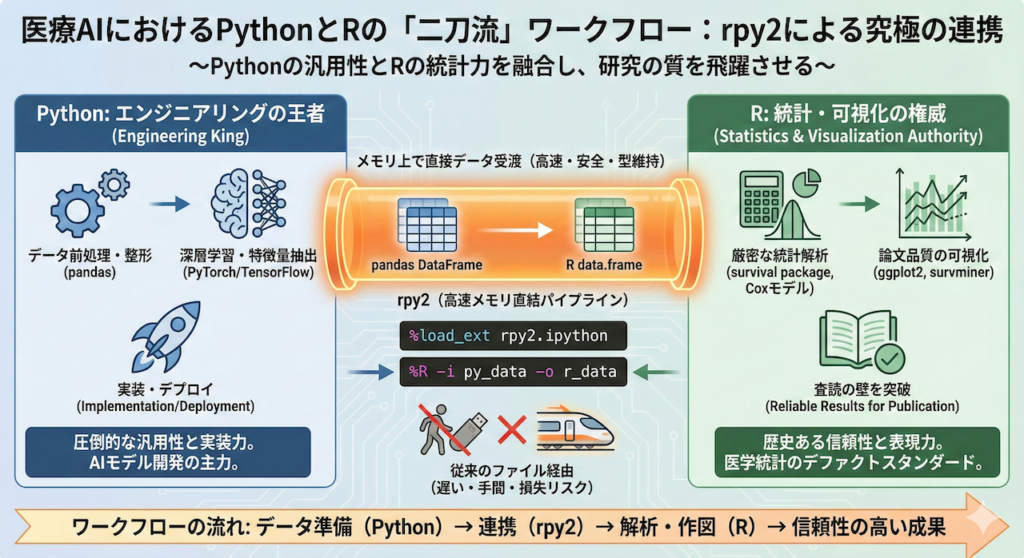 この役割分担を深く理解し、rpy2 という架け橋を自由に渡れるようになること。それは単に「使えるツールが増える」以上の意味を持ちます。あなたの研究結果に対する質(Quality)と、医学的な信頼性(Reliability)が飛躍的に向上することを意味するのです。