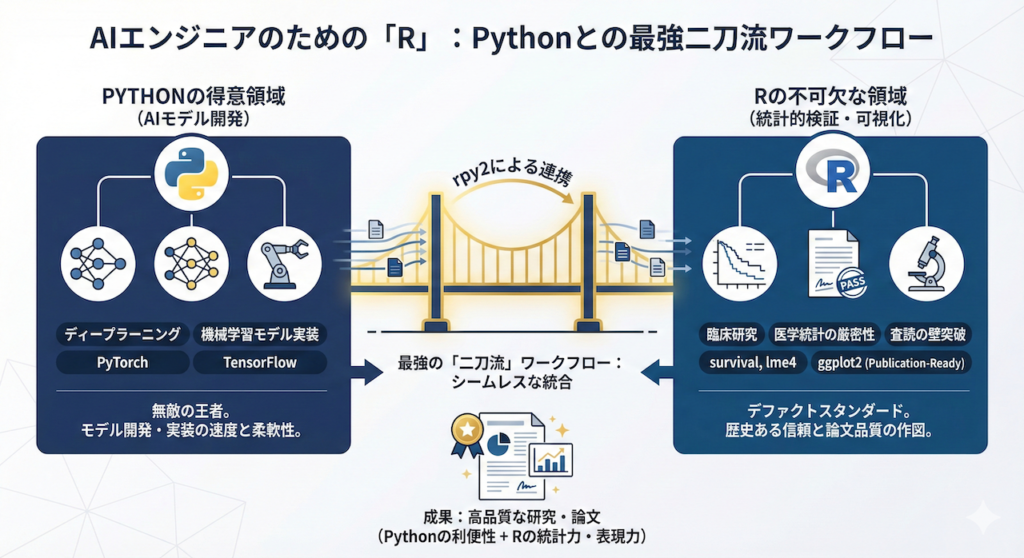 データサイエンスの世界では長らく、「Python(汎用性・深層学習に強い)」と「R(統計解析・可視化に強い)」のどちらを使うべきかという議論がありました。しかし、医療AI開発の現場における正解は「両方使う」です。