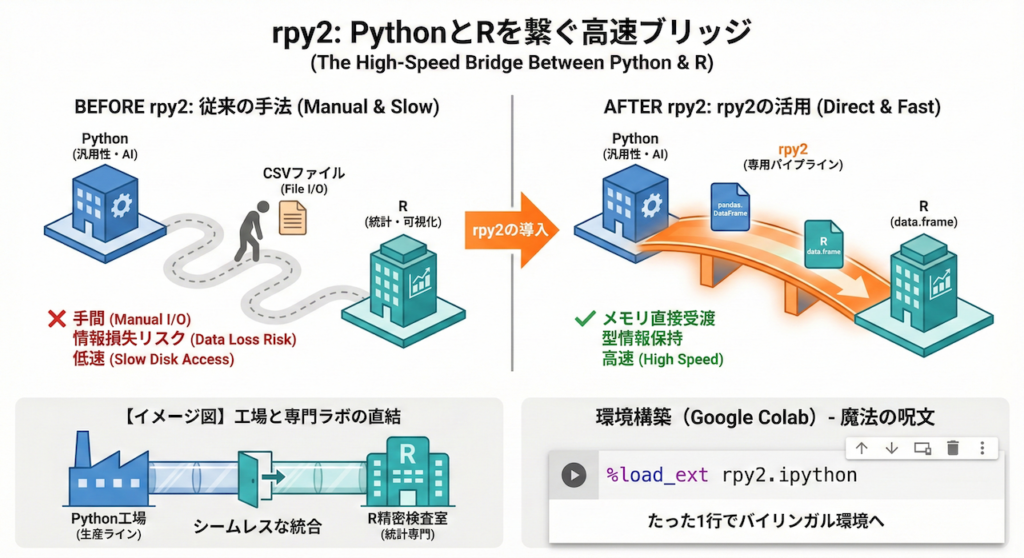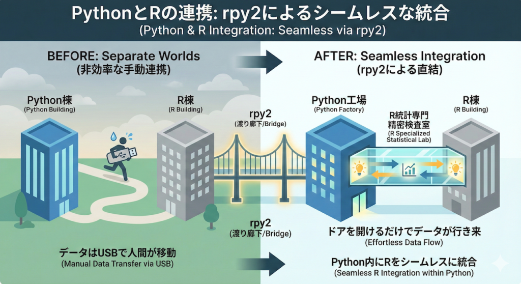 たとえるなら、これまでは「Python棟」と「R棟」が別々の建物で、データをUSBメモリに入れて人間が走って移動していた状態でした。rpy2 は、この二つの建物を渡り廊下で直結し、ドアを開けるだけでデータを行き来できるようにした状態と言えます。これにより、Pythonという工場の生産ラインの中に、Rという「統計専門の精密検査室」をシームレスに組み込むことが可能になるのです。