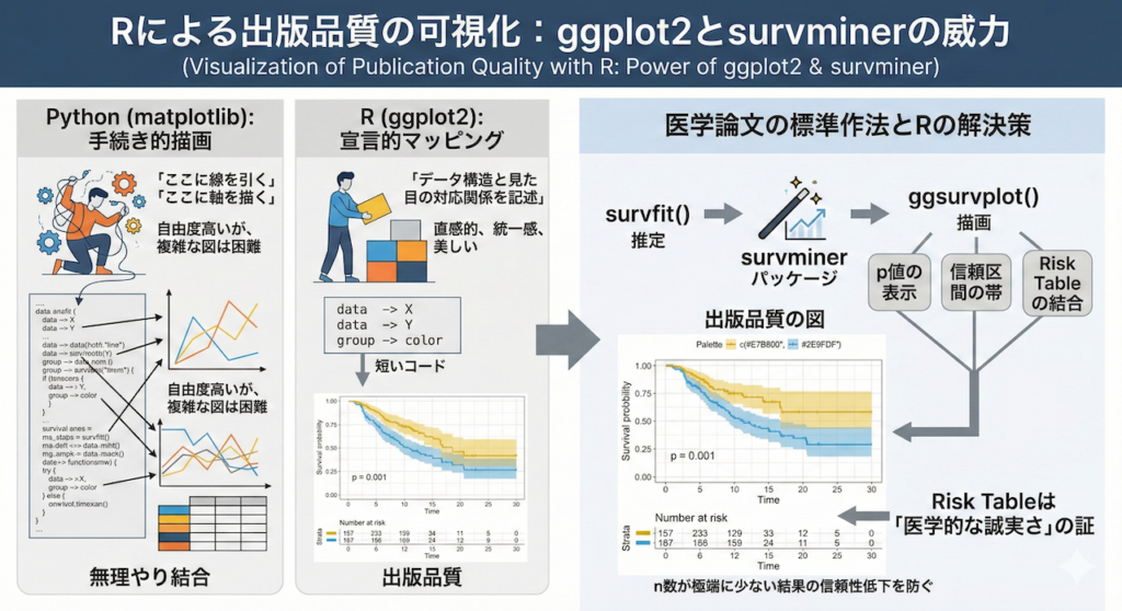 医学統計の歴史において、R言語(およびそのパッケージ群)は長年にわたりデファクトスタンダードの地位を築いてきました。多くの医学論文で引用される統計手法や検定アルゴリズムは、Rのパッケージ(例えば survival や lme4 など)を基準に実装・検証されています。Pythonの scikit-survival や lifelines も素晴らしいライブラリですが、歴史あるRのパッケージが持つ機能の網羅性や、査読者からの信頼感には一日の長があります。
