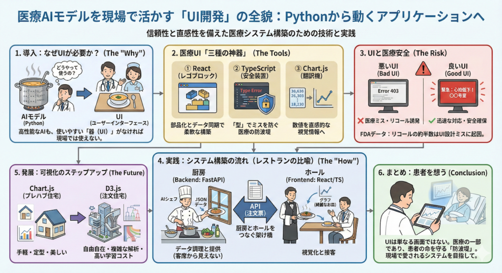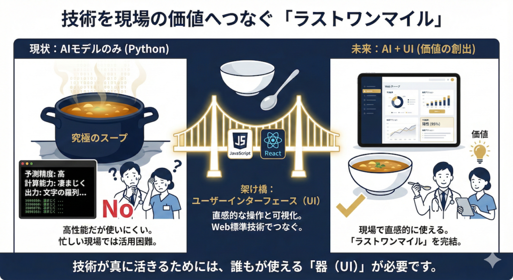 これまでの講義で作ってきた PythonのAIモデル は、まさにこの「鍋に入ったままのスープ」です。計算能力は凄まじく、予測精度も高いかもしれません。しかし、黒い画面(ターミナル)に文字の羅列だけで結果が表示されるシステムを、分刻みのスケジュールで動く忙しい診察室の医師や看護師が使いこなせるでしょうか?