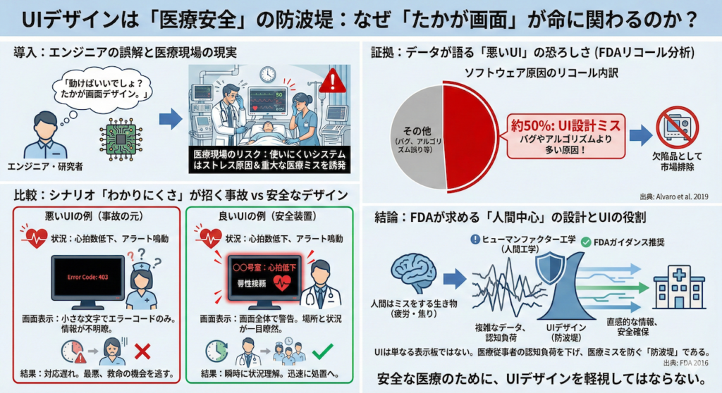 エンジニアや研究者が陥りがちなこの考えは、医療現場においては致命的なリスクを孕んでいます。なぜなら、使いにくいシステムは単なるストレスの原因になるだけでなく、患者の命に関わる重大な医療ミスを引き起こす可能性があるからです。