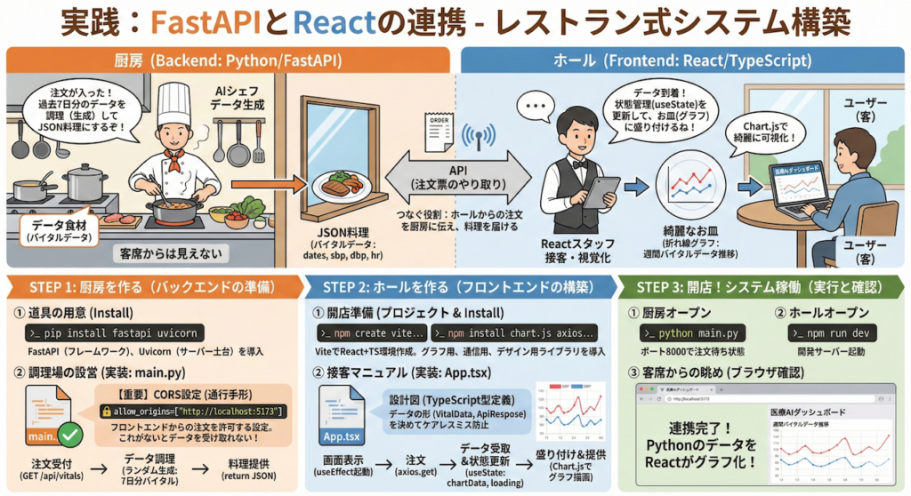 これから行う「FastAPIとReactの連携」とは、この「遠距離通話の仕組み」を作ることと同義です。それでは、まずは遠くで待機する「厨房(バックエンド)」の構築から始めましょう。