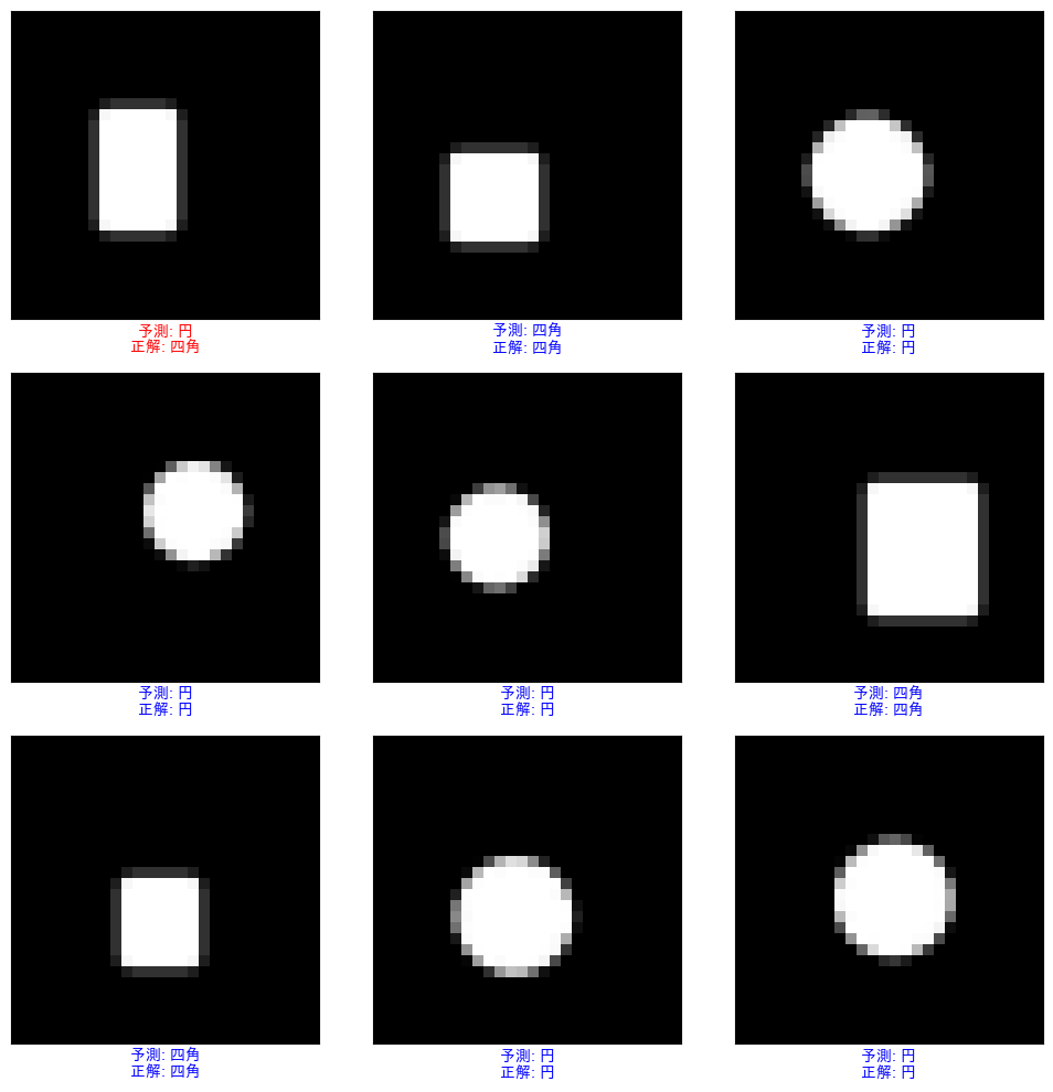 すべてが上手くいけば、最後に表示される9つの画像では、ほとんど(あるいはすべて)の予測が正解し、ラベルが青色で表示されているはずです。AIが、一度も見たことのない「円」と「四角」を正しく見分けられた瞬間です。ちょっと感動しませんか?