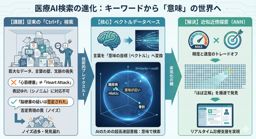 従来のキーワード検索(いわゆる「Ctrl+F」の世界)では、このミッションは不可能です。なぜなら、医療現場における「言葉」は、あまりにも多様で文脈依存的だからです。