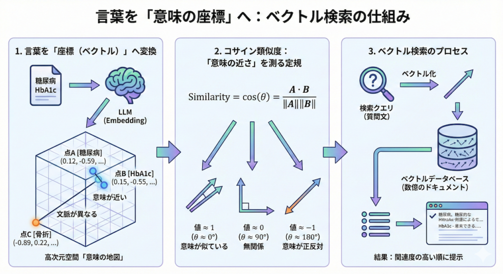 この空間内では、「糖尿病」と「HbA1c」は医学的に関連が深いため、座標上の距離が非常に近くなります。一方で、「骨折」はこれらとは遠い場所に配置されます。ベクトル検索では、この「ベクトル間の距離(または角度)」を計算することで、類似度を判定します。