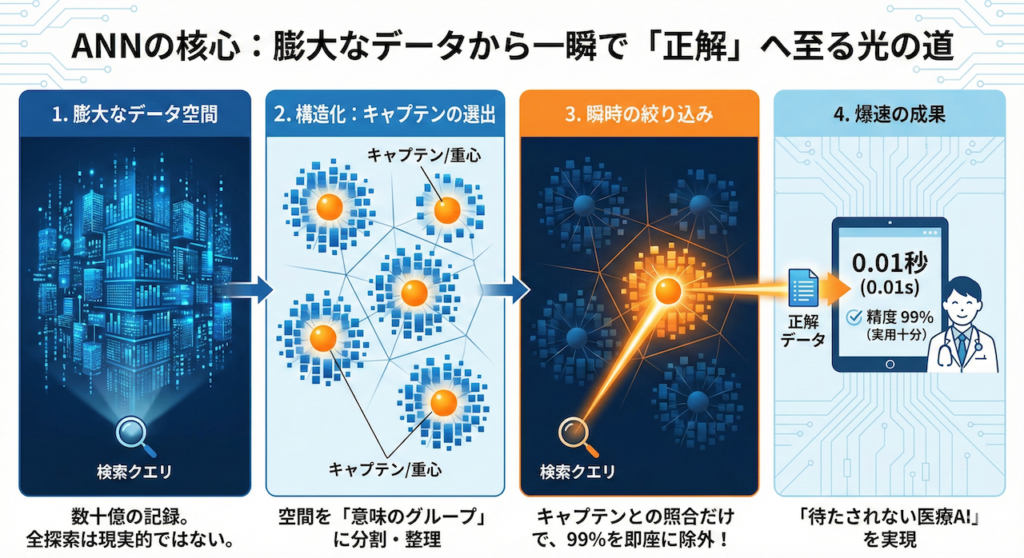 全探索(KNN)が「1400万人全員の身長を一人ずつ測る」ことだとすれば、数億件のデータを扱う医療AIにおいては、より賢いアプローチが必要です。そこで登場するのが、ANN(Approximate Nearest Neighbor:近似近傍探索)です。