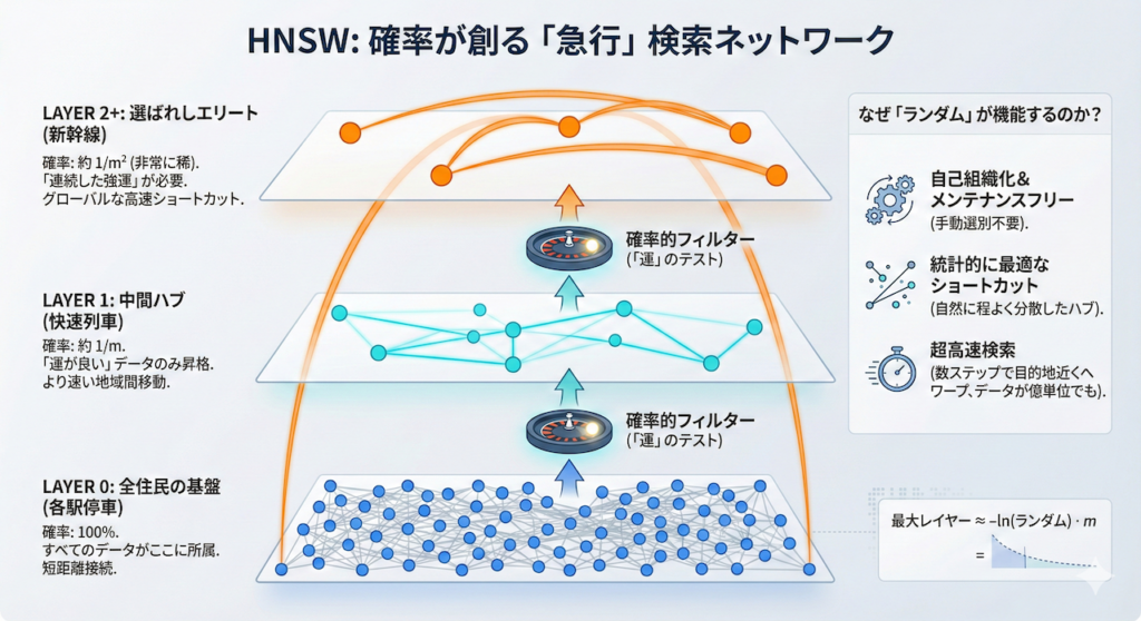 実は、このエリート選別には複雑な審査などは一切なく、「純粋な確率(ランダム)」によって決定されています。これこそが、HNSWが自己組織的であり、メンテナンスフリーで動作する最大の理由です。
