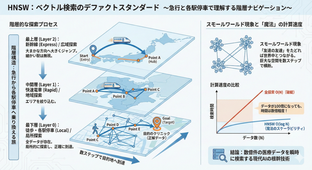 現在、ベクトル検索の世界で「デファクトスタンダード(事実上の標準)」として君臨し、OpenAIやMeta(Facebook)、そして多くの医療系AIスタートアップが採用しているアルゴリズム。それが、HNSW(Hierarchical Navigable Small World)です。