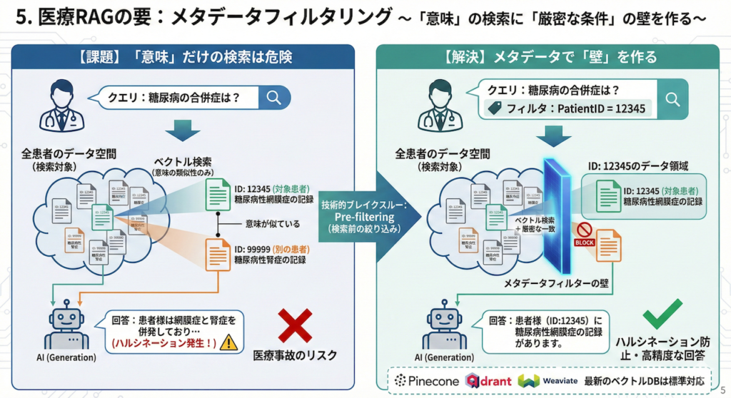 - リスク: 単なるベクトル検索(意味の類似度のみ)を行ってしまうと、システムは「別の患者(ID: 99999)の糖尿病の記録」まで、意味が似ているという理由で拾ってきてしまいます。
