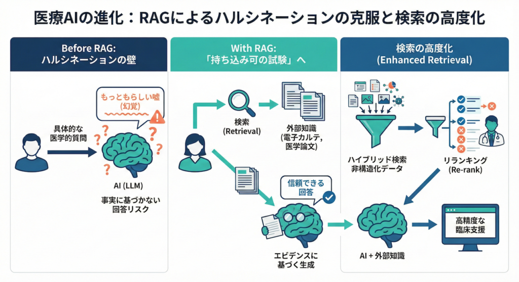 例えるなら、記憶力と文章作成能力は抜群だけれど時々勘違いをする研修医に対して、あらかじめ該当する患者のカルテと最新の診療ガイドラインを渡し、「まずはこの資料をしっかり読んでから、答えをまとめてね」と指示を出すようなものです。つまり、AIに「持ち込み可の試験」を受けさせるようなアプローチだと言えます。