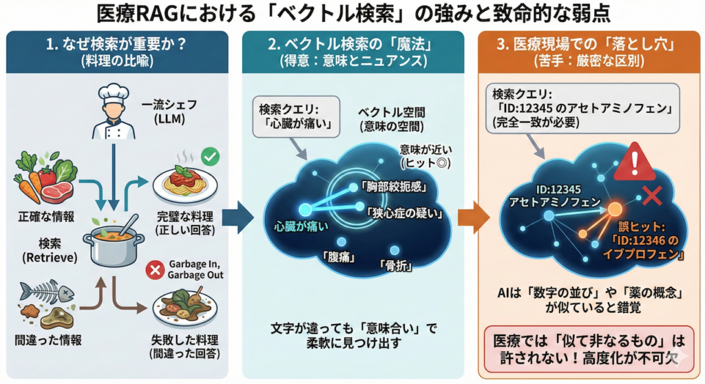 しかし、医療現場において、この「意味検索」だけに頼ることは、時に致命的な弱点となります。ここがRAG構築の落とし穴なのですが、ベクトル検索は「大まかなニュアンス」を捉えるのは得意でも、「厳密な区別」がとても苦手なのです。