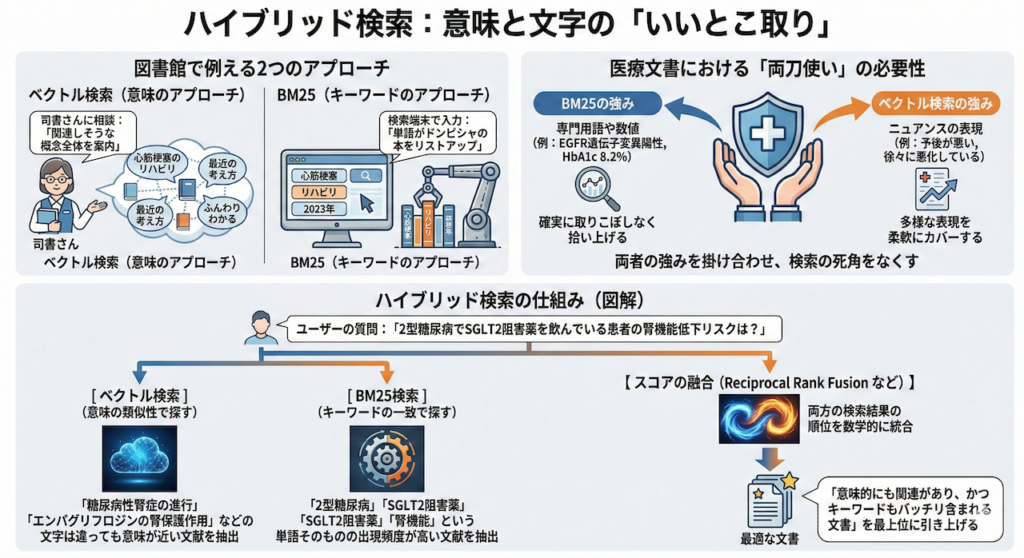 例えば、カルテの中から情報を探すとき、「EGFR遺伝子変異陽性」や「HbA1c 8.2%」といった特定の専門用語や数値は、BM25を使って確実に取りこぼしなく拾い上げる必要があります。一方で、「予後が悪い」「徐々に悪化している」といった、医師によって書き方が多様に変化するニュアンスの表現は、ベクトル検索の柔軟性でカバーするのです。このように、両者の強みを掛け合わせることで、検索の死角をなくすことができます。