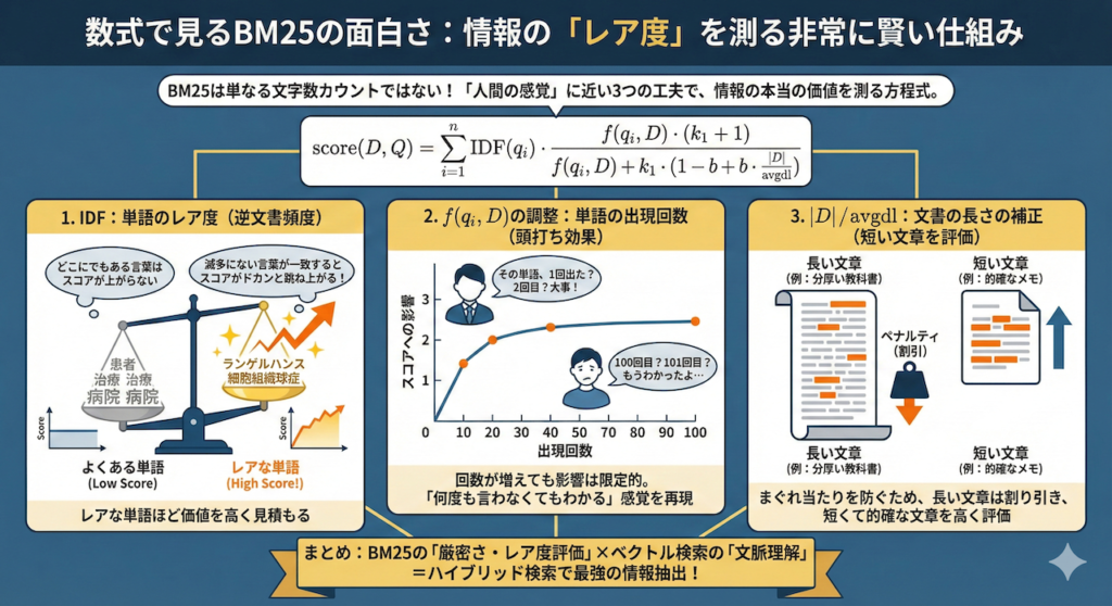 BM25は、単純に「検索した単語がたくさん入っている文章が一番エライ」という単純な文字数カウントではありません。「レアな単語が入っている文章の価値を、より高く見積もる」という、非常に賢い仕組みを持っています (Robertson et al., 2009)。