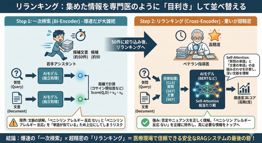 - リランキング(Cross-Encoder):ベテランの指導医が、その50冊のファイルを1つ1つ丁寧に開き、今回の患者さんの複雑な病歴や質問の意図とじっくり照らし合わせて、「この記録は表面的には似てるけど別の話だな」「お、この3ページ目の記述は今回の症例にドンピシャだ」と吟味し、本当に重要なトップ5冊を厳選して並べ直す作業です。
