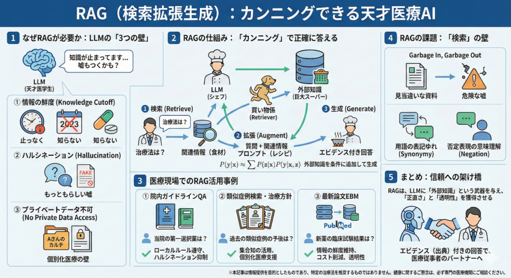 これにより、LLMは「嘘をつく確率」を劇的に減らし、常に「根拠(エビデンス)」に基づいた回答ができるようになります。医療AIの実装において、現在最も重要と言っても過言ではないこの技術の全貌を、紐解いていきましょう。
