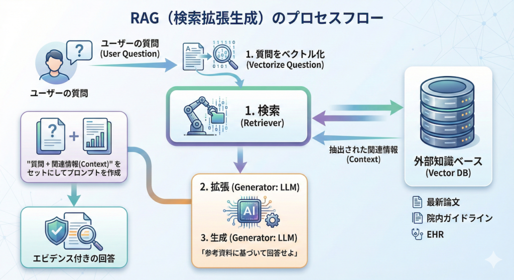RAG(Retrieval-Augmented Generation)は、これらの課題を一挙に解決します。LLMに対して、自身の記憶(学習済みパラメータ)だけに頼ることを禁止し、外部の信頼できるデータベース(最新論文や電子カルテ)から関連情報を検索(Retrieve)させます。