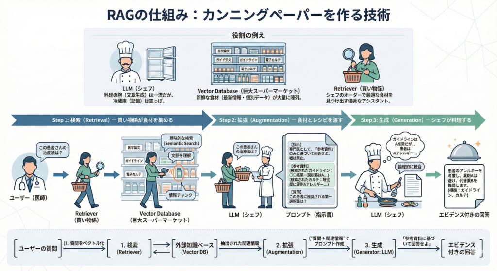 - Vector Database(巨大スーパーマーケット): 新鮮な食材(最新の医学論文、ガイドライン、目の前の患者さんのカルテ情報)が大量に陳列されています。