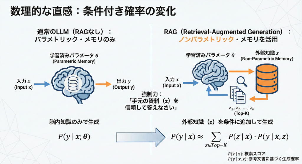 一方、RAGは外部の知識 \( z \)(検索された文書)を利用します。これは「ノンパラメトリック・メモリ(Non-Parametric Memory)」と呼ばれ、モデルの重み(\( \theta \))を変えずに知識を追加・更新できる部分です。