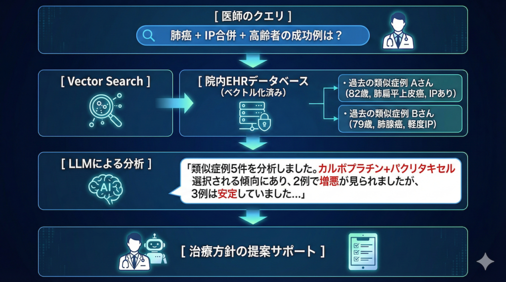 - 意味的検索: キーワードが完全に一致しなくても、「意味的に近い」症例(同じような背景を持つ患者)を抽出します。