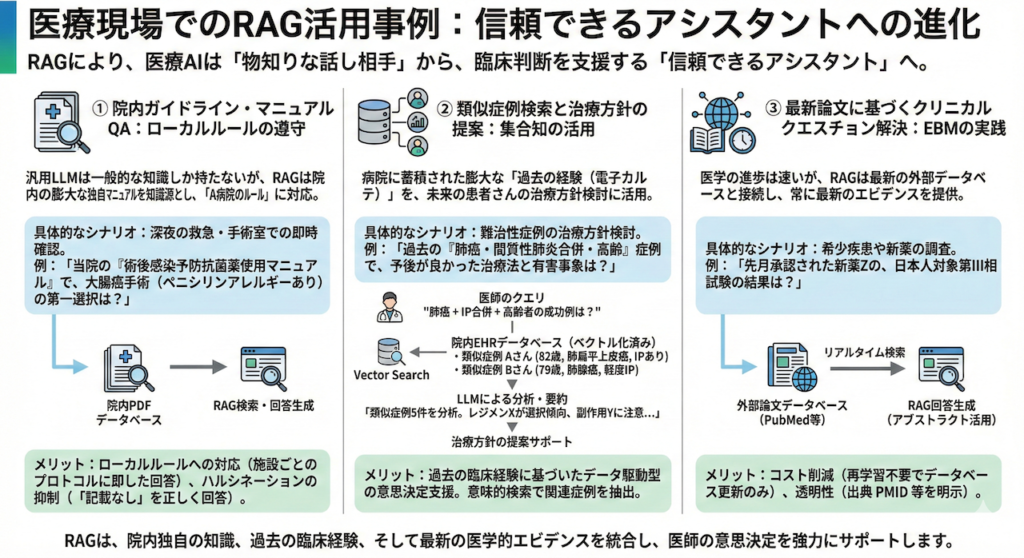 医学の進歩は速く、LLMの学習データはすぐに陳腐化します。RAGは、インターネット上の最新データベースと接続することで、常に最新のエビデンスを提供します。
