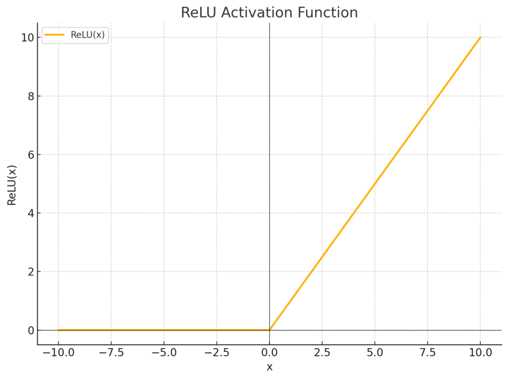 - ReLU関数 (Rectified Linear Unit): 現代の深層学習で最も広く使われている「活性化関数」の一つです。ルールは極めてシンプルで、「入力が0より大きければそのまま出力し、0以下なら0を出力する」というものです。数式では \(f(x) = \max(0, x)\) と書けます。単純なルールですが、この小さな「非線形性」(0でカクっと折れ曲がる点)を持つ部品を何百万と組み合わせることで、ニューラルネットワークは非常に複雑で柔軟な表現力を獲得するのです。