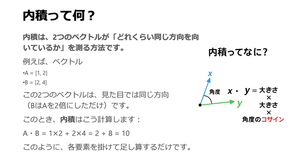 • 内積は、ベクトルの角度に関する情報を含んでおり、2つのベクトルの関係性を測るための重要な計算です。