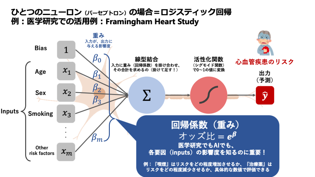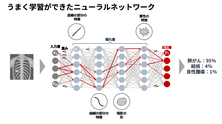 これは、私たちが診断を下すプロセスに似ています。例えば、ある疾患を疑うとき、特異度の高い検査結果(A)には大きな「重み」を置き、一方でよく見られる一般的な症状(B)には比較的小さな「重み」を置きますよね。AIの重みもまさにその役割で、学習を通じて、どの情報が重要なのかを自動で調整していきます。