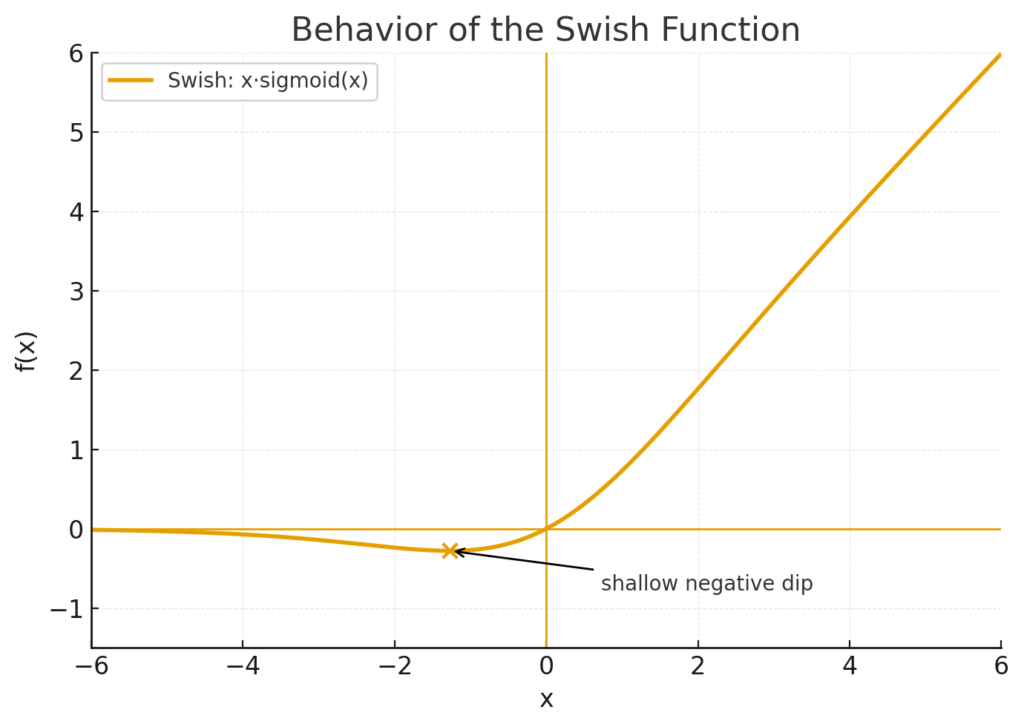 Swishは、Googleの研究者らが提案した非常に強力な関数で、SiLU (Sigmoid-weighted Linear Unit) とも呼ばれます。その式は \(f(x) = x \cdot \text{sigmoid}(x)\) と、驚くほどシンプルです。