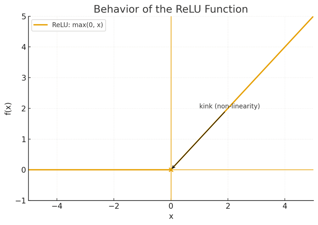 図の解説:この図はReLU関数の振る舞いを視覚的に表したものです。横軸が入力\(x\)、縦軸が出力\(f(x)\)です。入力\(x\)がマイナスの領域では、出力は常に0(横軸にピッタリくっついています)。入力\(x\)が0を超えると、出力は入力とまったく同じ値を取る傾き1の直線(\(y=x\))になります。原点(0,0)でカクっと折れ曲がっているのが特徴で、この「折れ曲がり」こそがAIに非線形性をもたらす源泉なのです。