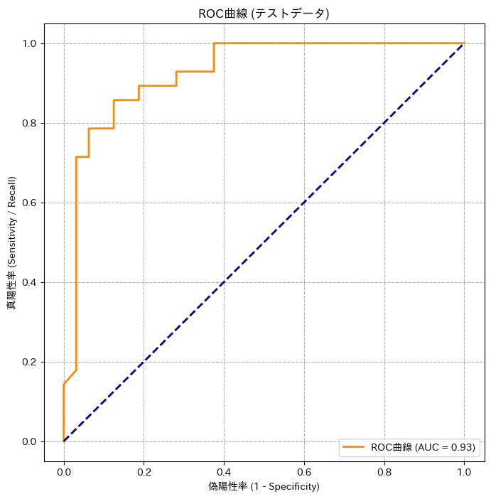 plt.ylabel('真陽性率 (Sensitivity / Recall)')