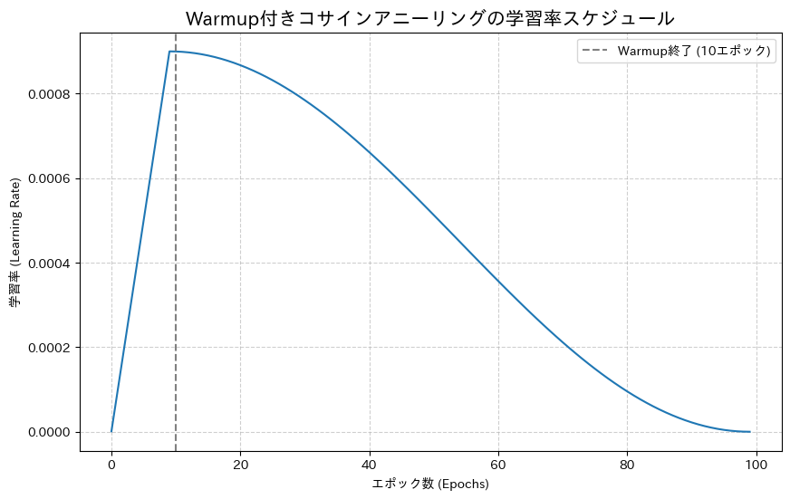 3. 実装:Warmup付きコサインアニーリングを可視化する 〜理論をグラフで見て、深く理解する〜