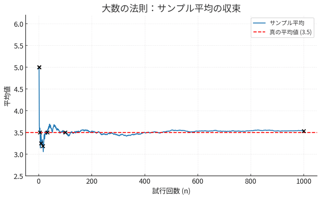 図の解説: この図は、横軸にサイコロを振った回数(試行回数)、縦軸に出た目の平均値を示しています。最初はxの位置が大きくブレていますが、試行回数が増えるにつれて、平均値が真の値である3.5の水平線に近づいていく様子がイメージできるかと思います。