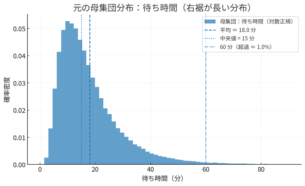 例えば、病院の外来患者さんの「待ち時間」を思い出してください。ほとんどの方は10〜20分で診察に呼ばれる一方、緊急の患者さん対応などがあれば、ごく稀に1時間以上待つ方もいるかもしれません。この「待ち時間」のデータを集めて分布を見ると、おそらく正規分布のような左右対称の形にはならず、長い待ち時間の方に裾が伸びた、いびつな形(右に歪んだ分布)をしているはずです。