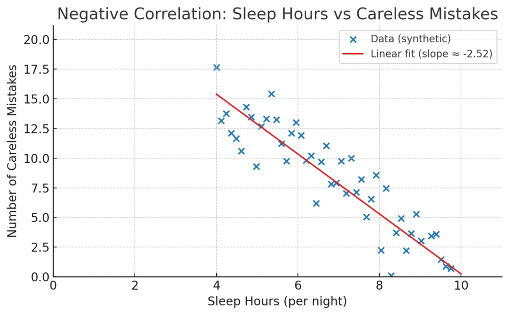 - 負の相関 (Negative Correlation): 片方が増えるにつれて、もう片方が減る傾向。こちらは右肩下がりの帯を描きます。「睡眠時間が増えるほど、日中のケアレスミスの回数が減る傾向がある」といった関係がこれにあたります。一方が上がれば、もう一方が下がる、美しいハーモニーです。