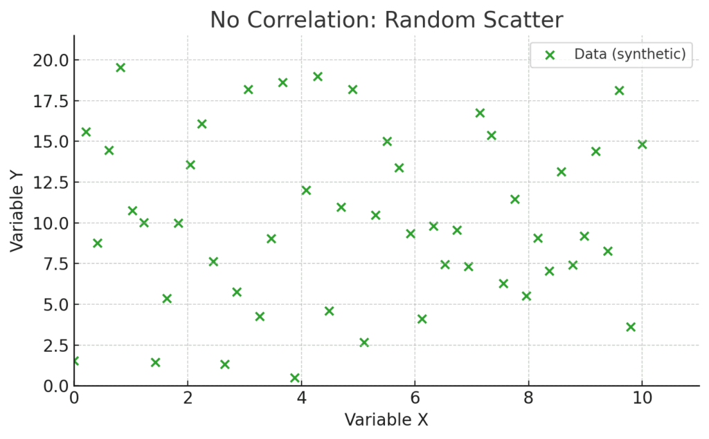 | r ≒ 0 | ほとんど相関なし | 点が特定のパターンなく、雲のように散らばる |