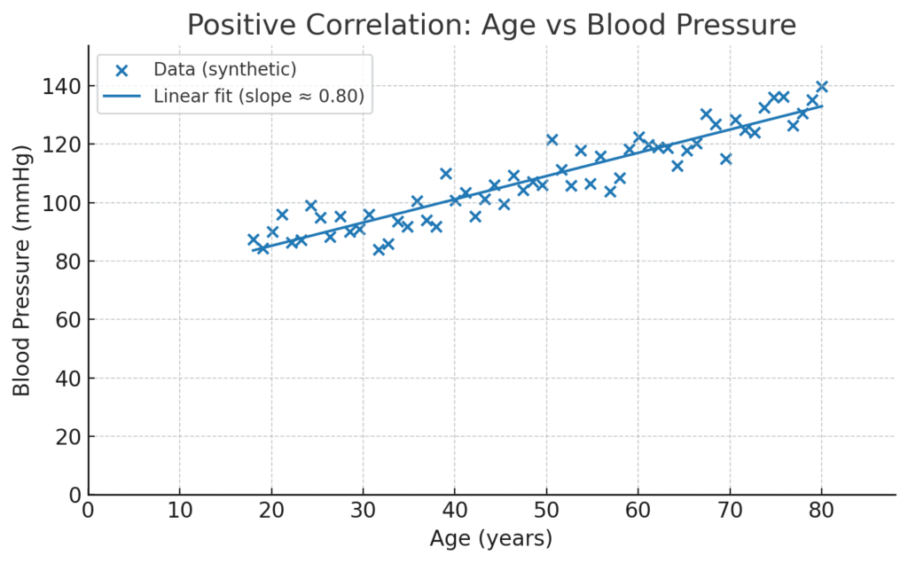 - 正の相関 (Positive Correlation): 片方の変数が増えるにつれて、もう片方も増える傾向です。散布図では、点の群れが右肩上がりの帯を形成します。「年齢が上がるほど、血圧も高くなる傾向がある」といった関係ですね。まるで息の合ったデュオが、一緒に音程を上げていくようです。