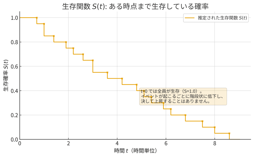 この生存関数をグラフにすると、特徴的な形になります。スタート時点(\(t=0\))では、全員がまだ走り始めているので生存確率は1.0(100%)です。そして、誰かがイベントを迎える(ゴールする)たびに、その確率はカクンと階段状に下がっていきます。選手がコースからいなくなることはあっても、戻ってくることはないので、この曲線が上がることはありません。