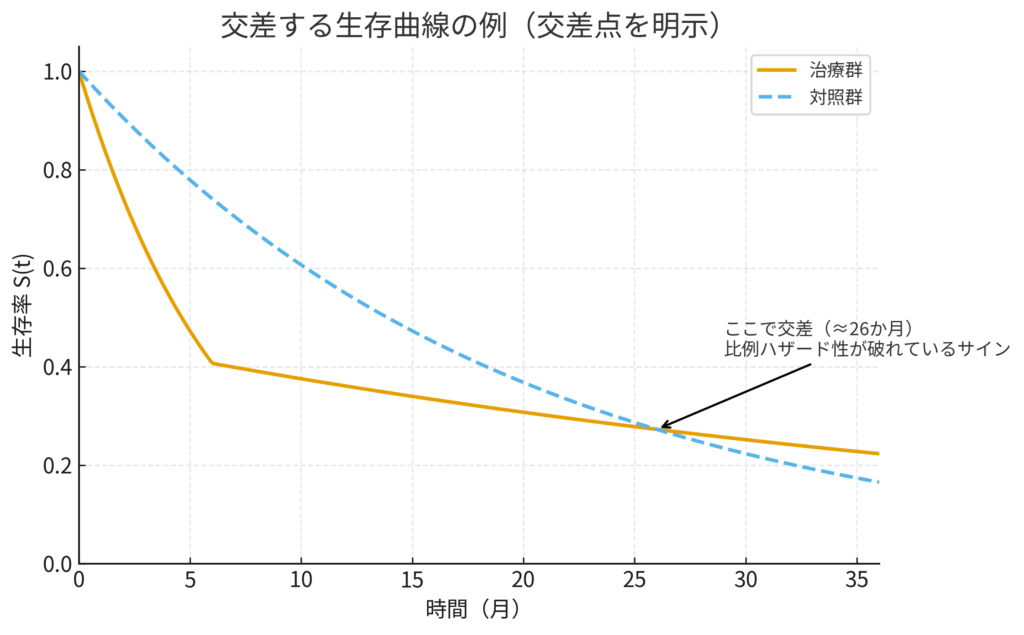 先ほどのドラッグレーサー(治療群)の例で考えてみましょう。序盤のリスクが非常に高いため、治療群の生存曲線はスタート直後に急降下します。しかし、その初期リスクを乗り越えた後はリスクが低くなるため、曲線はなだらかになります。一方、マラソンランナー(対照群)の曲線は、一定のペースで下がり続けます。すると、どこかの時点で、一度は下にあった治療群の生存曲線が、対照群の曲線を追い抜いて交差する、という現象が起こり得ます。