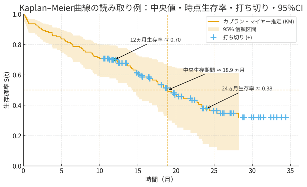 こうして描かれたカプラン・マイヤー曲線を見れば、いくつかの重要な指標を直感的に読み取れます。