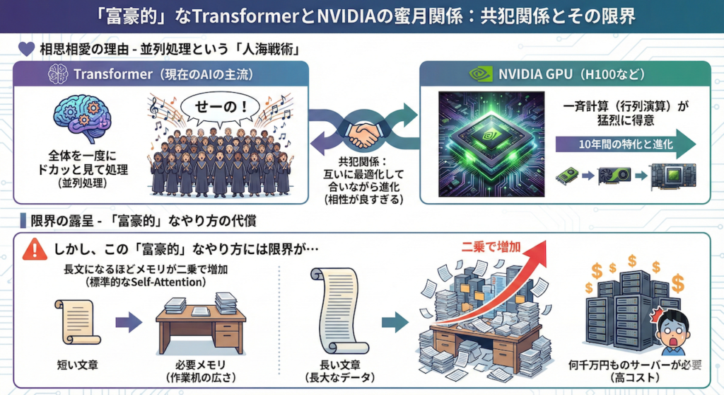 現在のAI業界は、NVIDIAのGPU(画像処理半導体)なしには語れません。なぜなら、現在の主流であるTransformerモデルが、NVIDIAのGPUが得意とする「並列処理(大量の計算を同時にこなすこと)」に極めて最適化されているからです。