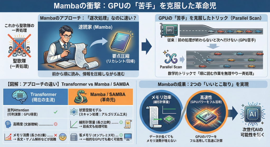 2. Mambaの衝撃:GPUの「苦手」を克服した革命児