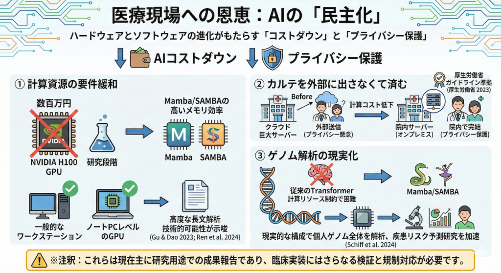 「計算コストが下がる」ということは、「クラウド上の巨大サーバーにデータを送らなくても、院内のサーバー(オンプレミス)でAIを動かせる」可能性が高まることを意味します。これは、厚生労働省のガイドライン等でも重視される個人情報保護の観点から決定的なメリットとなり得ます (厚生労働省 2023)。 - ゲノム解析の現実化
