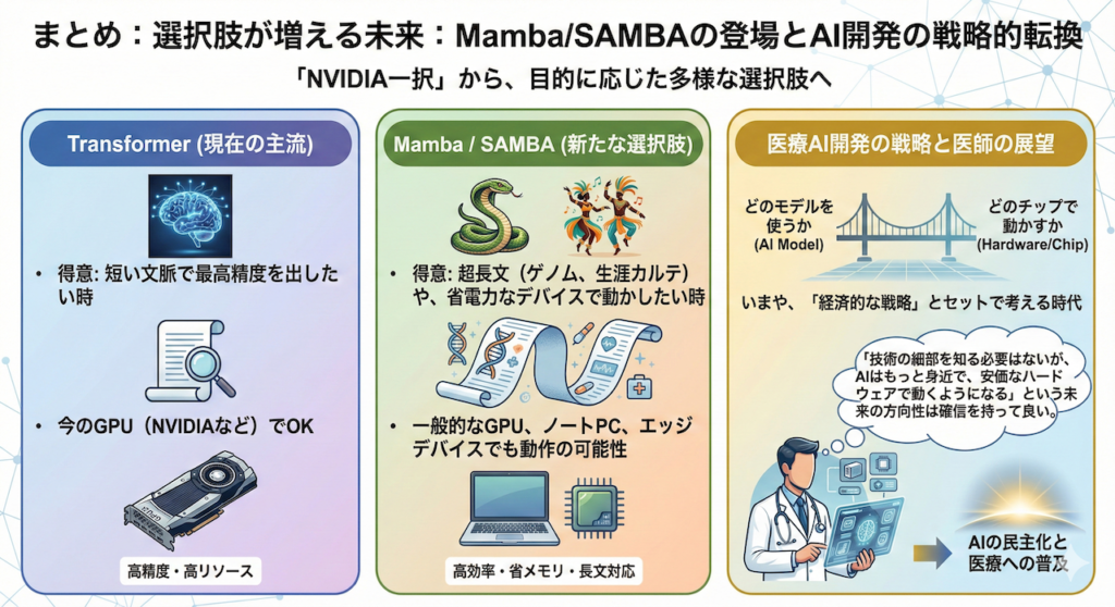 MambaやSambaの登場は、NVIDIAを脅かすというよりは、「NVIDIA一択」だった世界に選択肢をもたらすものです。