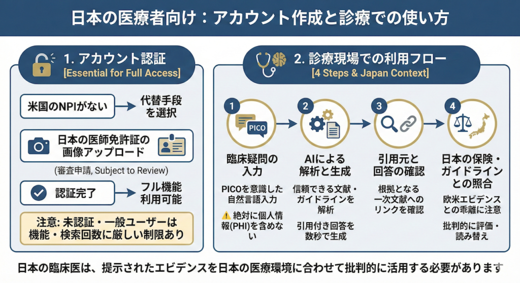 OpenEvidenceは元来、米国の医療従事者を対象として設計されたプラットフォームですが、日本の医師であっても適切な手続きを踏むことで、この強力な機能を日常診療に取り入れることが可能です。ここでは、日本の医師免許証を用いたアカウント作成の具体的な実態と、日本の医療環境下における利用の注意点を解説します。