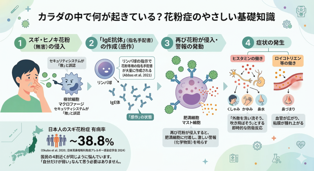 スギやヒノキなどの本来は無害な花粉が鼻や目の粘膜から侵入すると、カラダの最前線にいるセキュリティガード(樹状細胞やマクロファージなどの免疫細胞)は、その花粉を「危険な敵かもしれない」と誤って認識してしまいます。すると、司令塔であるリンパ球の指示により、「IgE抗体」という、いわば「花粉専用の指名手配書」が大量に作成されます (Abbas et al. 2021)。この状態を「感作(かんさ)」と呼びます。