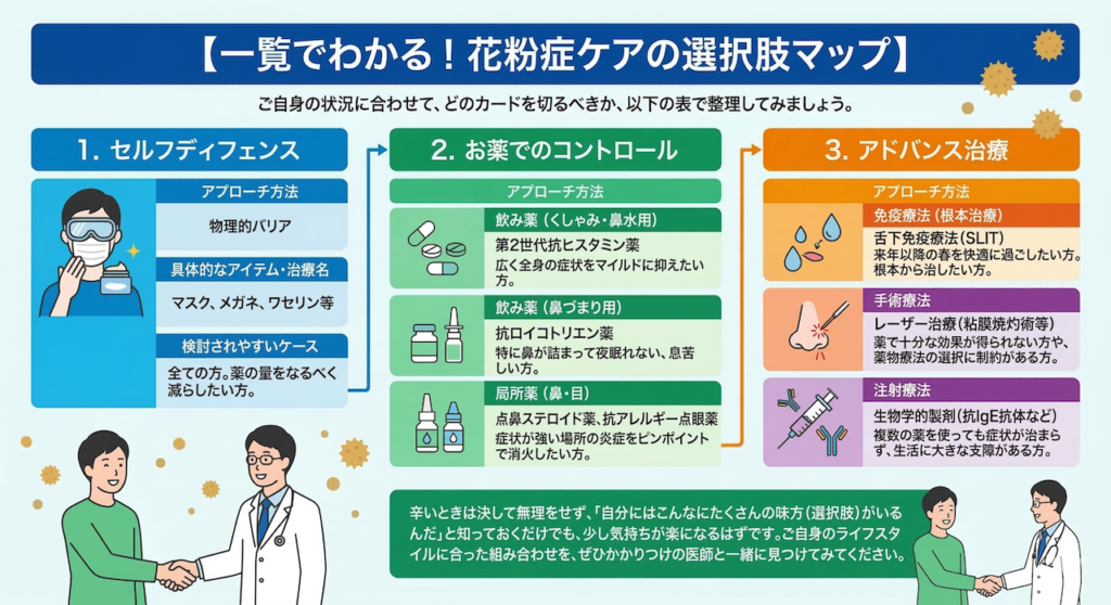 【一覧でわかる!花粉症ケアの選択肢マップ】