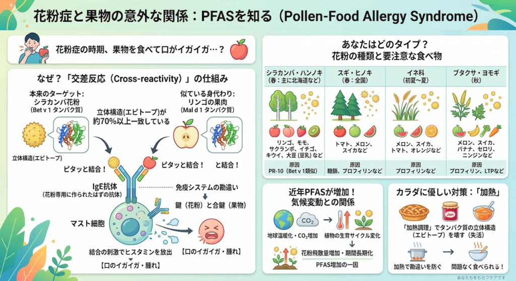 ウィーン医科大学のBreitenederらの研究によれば、花粉に含まれるアレルゲンタンパク質と、特定の果物や野菜に含まれるタンパク質(PR-10やプロフィリンなど)の分子構造は、まるで双子のように極めて高い相同性(類似性)を持っています(Breiteneder & Radauer 2004)。