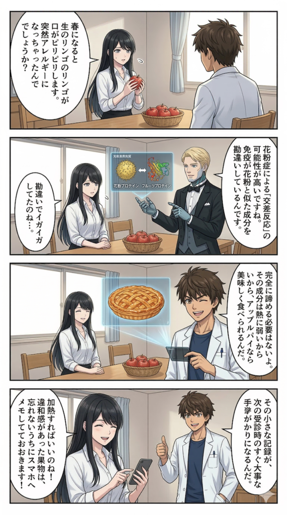 つまり、生のまま食べるのは難しくても、アップルパイやジャム、コンポートのように「加熱調理」をしてタンパク質の立体構造(エピトープ)を壊してしまえば、免疫細胞が「花粉だ!」と勘違いすることがなくなり、問題なく美味しく食べられるケースがほとんどなのです。カラダからの小さなアラート(警告)に優しく耳を傾け、少し工夫をしてそっと避けてあげるのも、予防医療の観点から見た立派な自己管理(セルフケア)の一つだと思います。