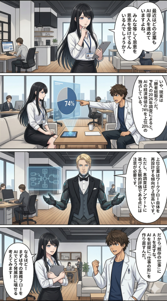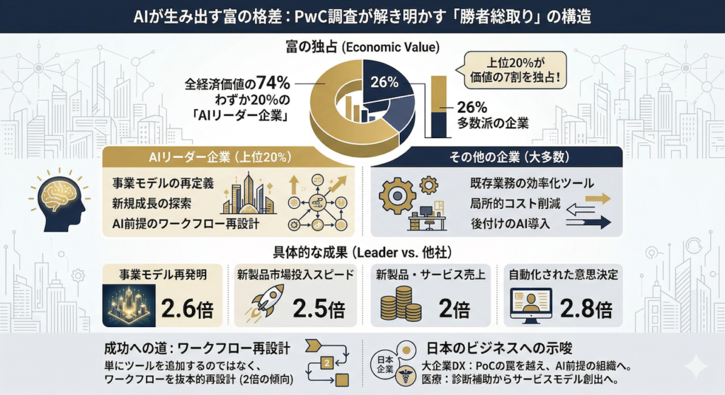 2026年4月13日、PwCが世界の経営幹部を対象としたAIの活用状況に関する調査レポートを発表しました。この報告の中で最も目を引く事実は、AIが生み出す経済価値の「74%」を、わずか20%の「AIリーダー企業」が独占しているという構造です(PwC 2026)。